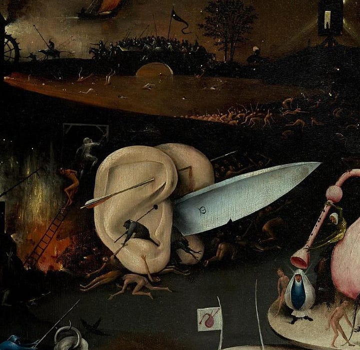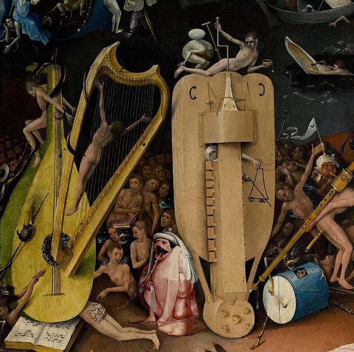Berger was writing about Hieronymous Bosch, specifically his famous triptych “The Garden of Earthly Delights”, a three-paneled painting depicting Eden, earth, and hell. Viewers have long been drawn to the panel for its strangeness. Where other artists have portrayed hell as a place of torture, it’s impossible to look at Bosch’s version and not see absurdity. A pair of enormous, fleshy ears wield a carving knife. A pig in a nun’s habit tries to seduce an emaciated man. A rabbit skewers a woman by her feet. Another figure dangles in the strings of a harp. To Berger, part of hell’s claustrophobia comes from its lack of meaning: “There is no continuity between actions, there are no pauses, no pattern, no path, no past and no future. There is only the clamour of the desperate, fragmentary present.”